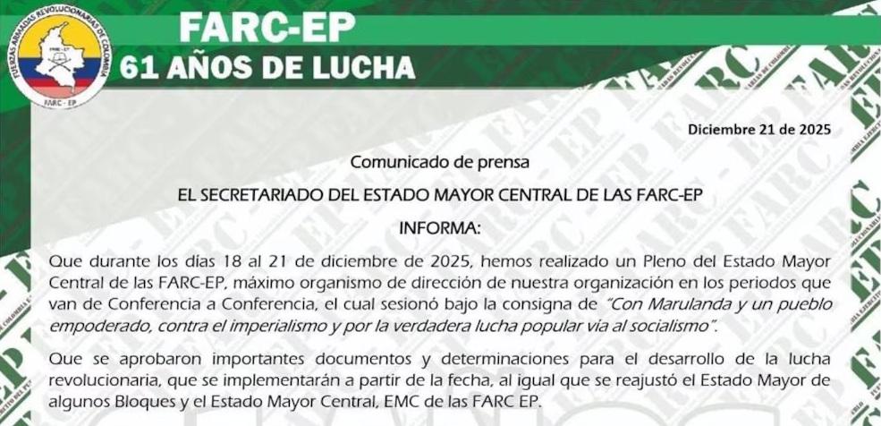 Abschließend teilen wir mit, dass wir unseren Einheiten im gesamten nationalen Territorium den Befehl erteilt haben, die offensiven militärischen Operationen gegen die öffentlichen Sicherheitskräfte vom 23. Dezember 2025 bis zum 7. Januar 2026 auszusetzen, mit dem Ziel, dass kolumbianische Familien diese Zeit ohne die mit einer bewaffneten Konfrontation verbundenen Ängste miteinander verbringen können. Wir behalten uns das Recht auf Selbstverteidigung vor.