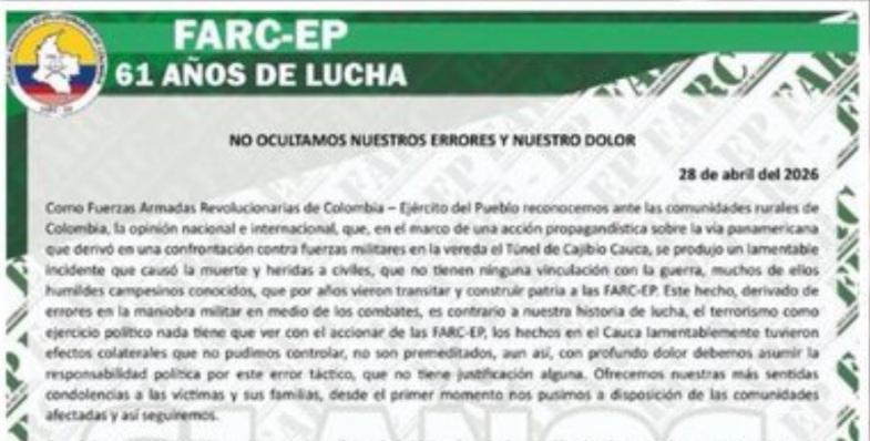 Der Zentrale Generalstab der FARC-EP hat sich in einem Kommuniqué vom gestrigen 28. April mit dem Titel „Wir verschweigen nicht unsere Fehler und unseren Schmerz“ zu dem Anschlag auf der Panamericana-Straße in der Gemeinde Cajibío, Provinz Cauca, geäußert, welches 20 Todesopfer forderte. In dem Kommuniqué erklärt die Guerilla unter dem Oberkommando von Iván Mordisco, dass der Vorfall während einer Auseinandersetzung mit der Staatsmacht stattfand und bezeichnet ihn als „bedauerlichen Vorfall“, der zivile Opfer gefordert habe, die laut den Angaben nichts mit dem Konflikt zu tun hätten. Des Weiteren erkennen sie an, dass der Vorfall ein „taktischer Fehler“ während der Operation war und versichern, dass es sich nicht um einen geplanten Angriff handelte. In diesem Zusammenhang erklären sie, die politische Verantwortung für die Ereignisse zu übernehmen.
